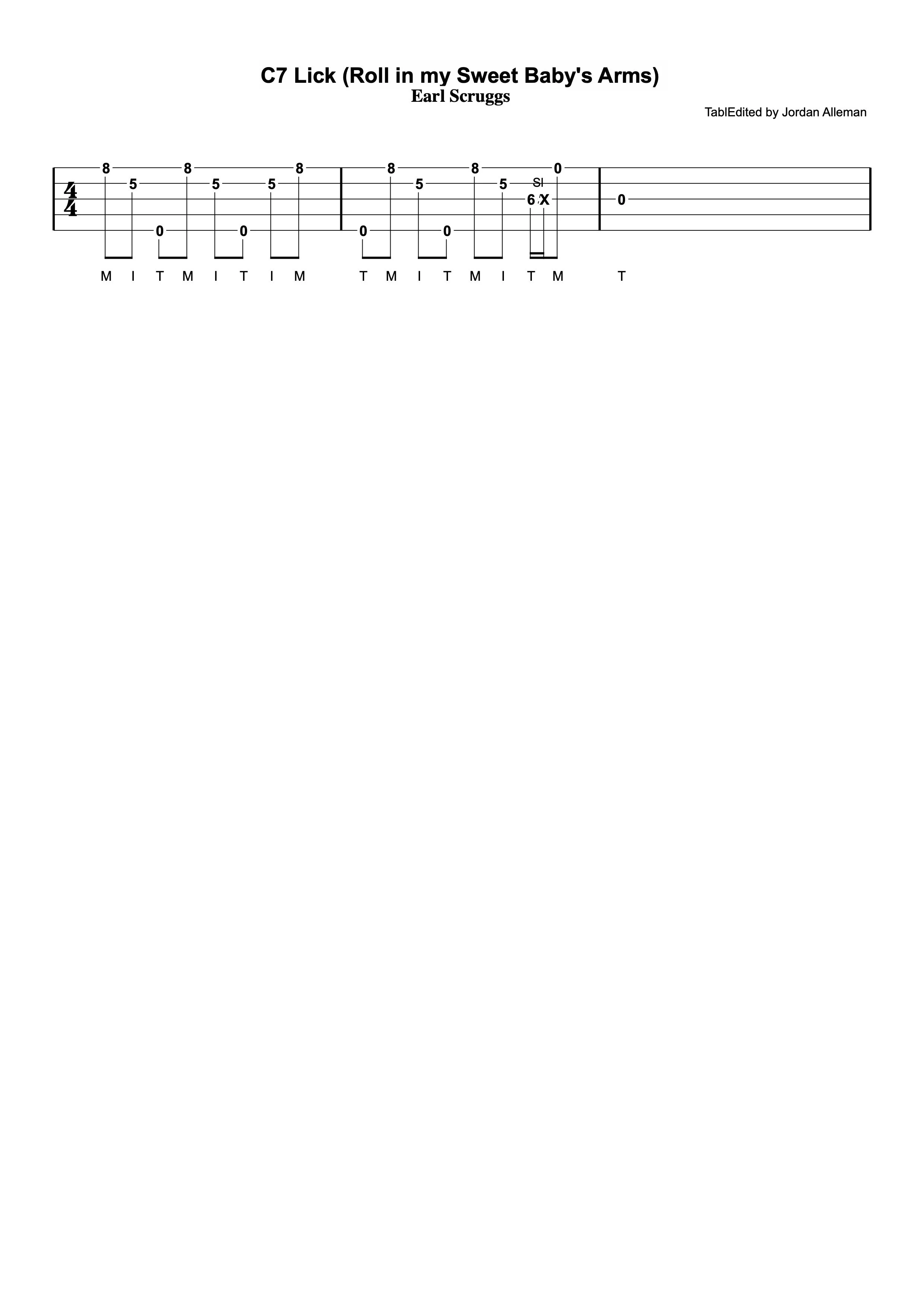 Here’s the tab for a C7 lick Earl used on Roll in my Sweet Baby’s Arms (among others). This one is great when you’re looking for a bluesy sound on a fast tune. Check out the lesson on YouTube to get some ideas on how to use it.